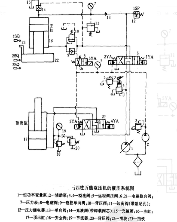 5、最后主缸停止時的狀態(tài) ,當主缸滑塊上的鐵23按下沖程開關1SQ時,電磁鐵2YA被切斷,主缸活塞被位于M功能中心的閥門6鎖定,停止運動,返回行程結(jié)束。此時,泵1油通過閥門6,閥門21返回油箱,泵處于卸載狀態(tài)。在實際使用中,主汽缸可以在任何時候停下來。